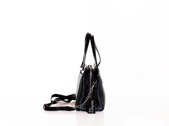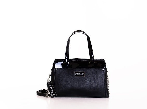 Altura: 19cm Base: 29cm Prof: 12cm Cartera de p.u combinada con charol Tres divisiones