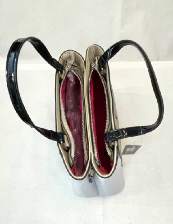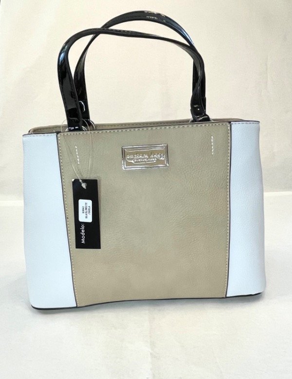 Cartera de p.u Blanca combinada con camel. Correa y manijas en charol negro.