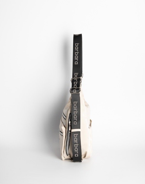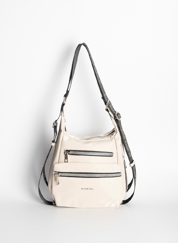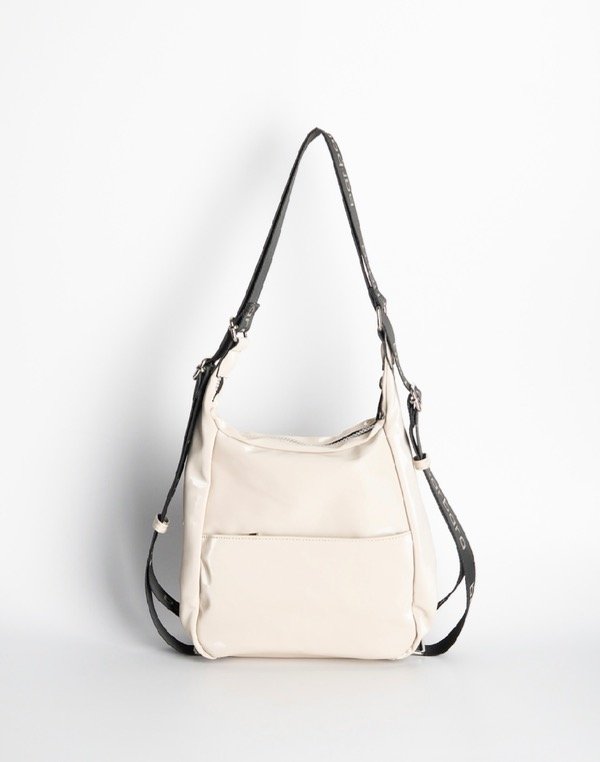 Altura: 30cm Base: 23cm Prof: 10cm Mochila de p.u Dos divisiones Un bolsillo trasero Dos a los lados Tres bolsillos internos Correa larga desmontable