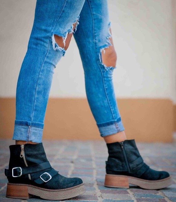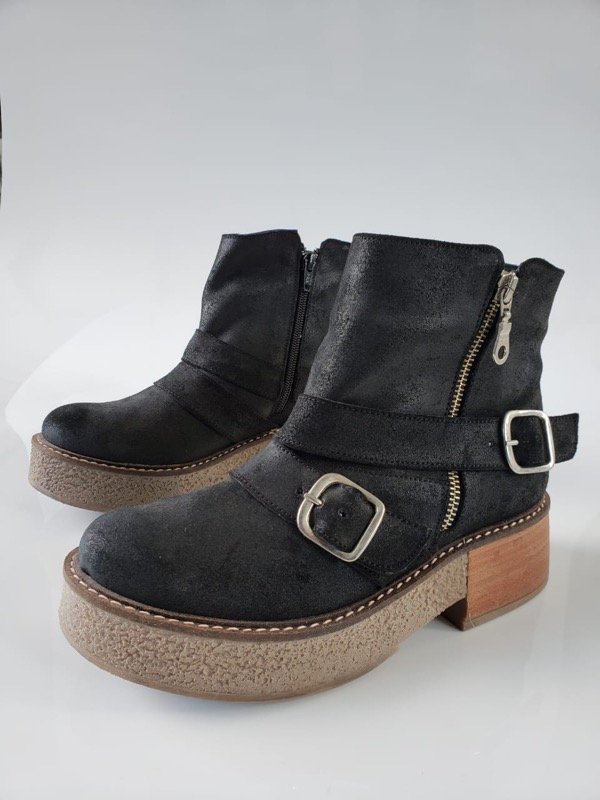 Borcegos de cuero gamuzado. Con cierre en un lateral. Taco trasero de 4,5cm aprox. Base de goma antideslizante de 3 cm aprox. Color Negro