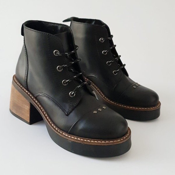 Borcegos de cuero. Acordonados. Base de goma antideslizante. Taco de 6 cm aprox. Color Negro