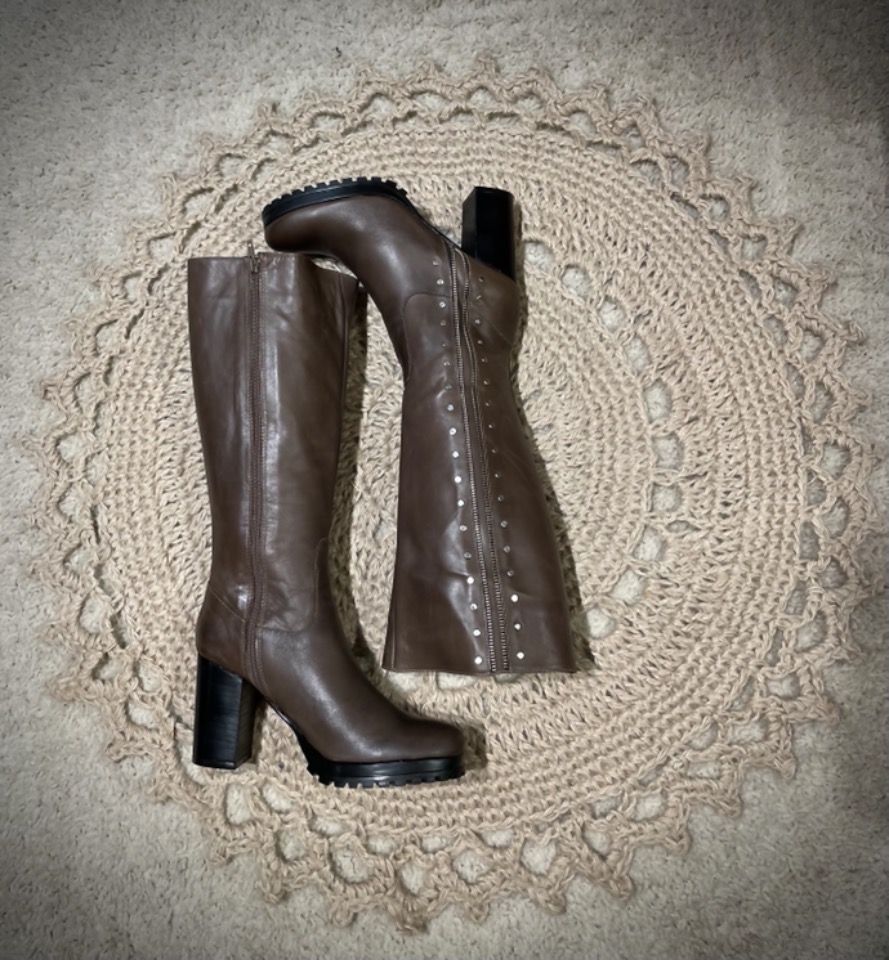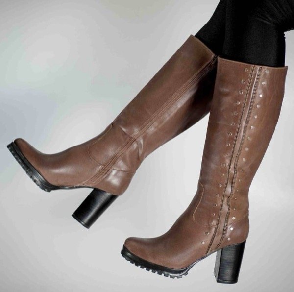 Botas de cuero. Caña larga de 32 cm aprox. Cierre en un lateral. Taco de 8,5 aprox. Color marrón.