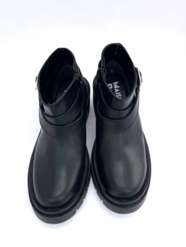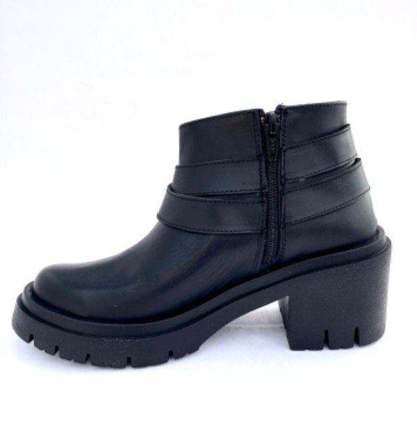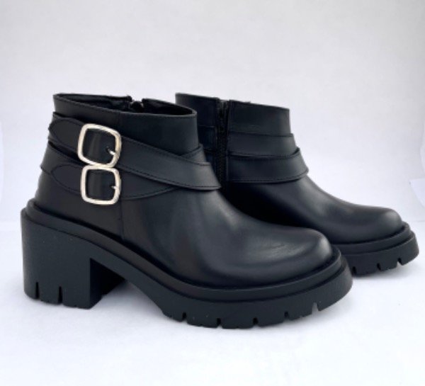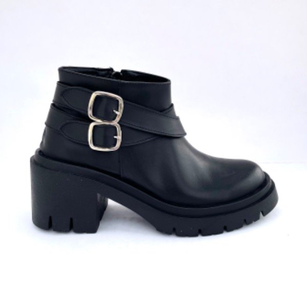 Botinetas de cuero. Color negro.Cierre en un lateral. Dos hebillas de adorno. Base de goma totalmente antideslizante. Taco de 6 cm. Aprox. Plataforma delantera de 2 cm aprox.