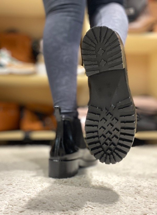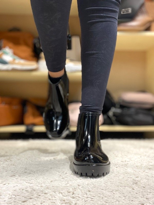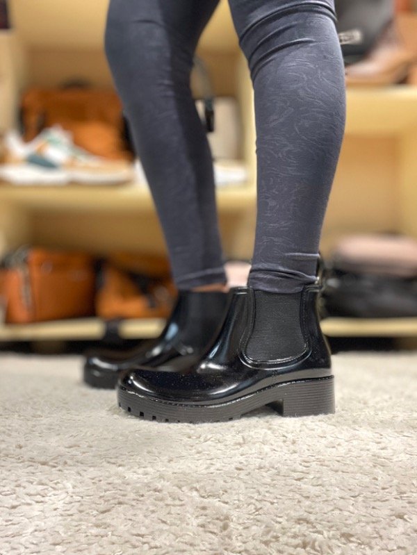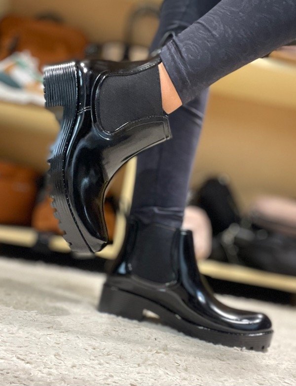 Botas de lluvia de goma. Elásticos laterales. Plataforma de 2 cm y taco de 4 cm. Color negro metalizado. Super cómodas!!!